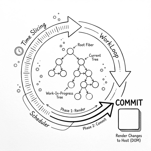 While our 400 lines of code omit the massive logic React uses to patch performance and edge cases, you still see the complete internals: how Fiber breaks long tasks into chunks, how useState attaches to the linked list, and why Effects must be committed after the DOM is built.